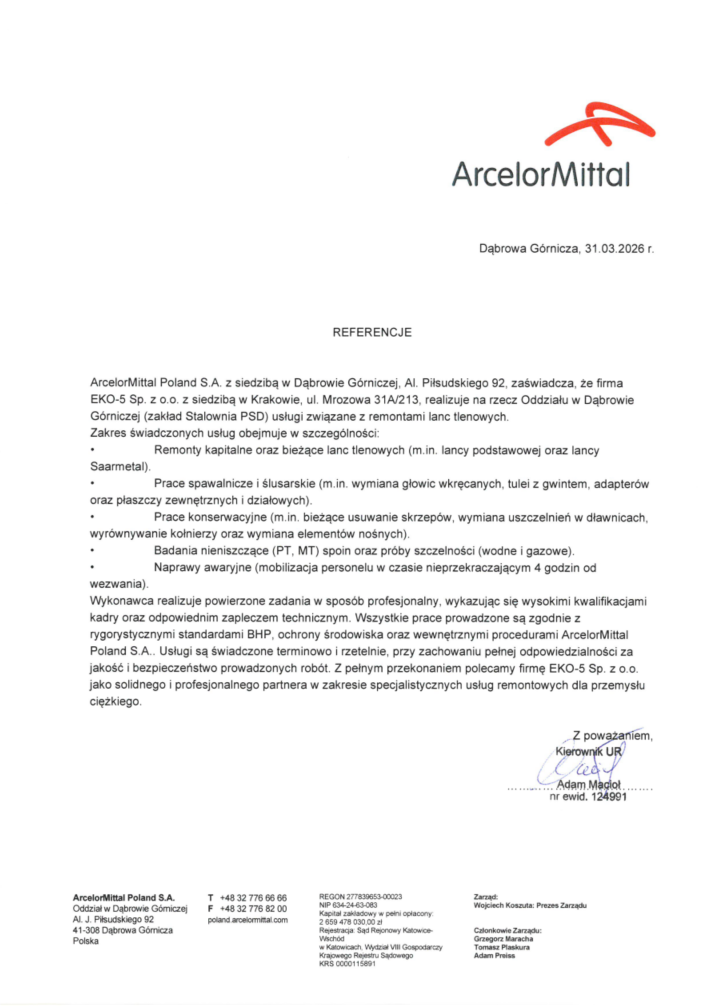 • PPUH Eko-Energia. Sp. z o.o. – Obsługa i remonty pras filtracyjnych szlamu na terenie wydziału PED w ArcelorMittal Poland S.A. Oddział Dąbrowa Górnicza